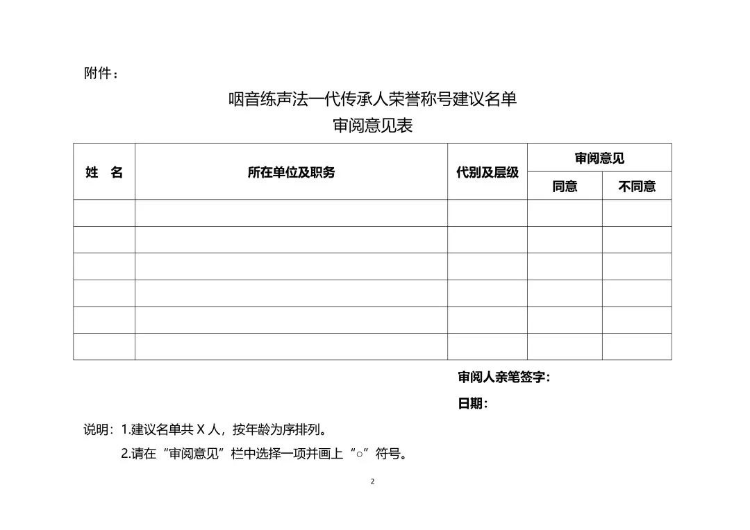 附件:咽音練聲法一代傳承人榮譽(yù)稱號(hào)建議名單審閱意見表